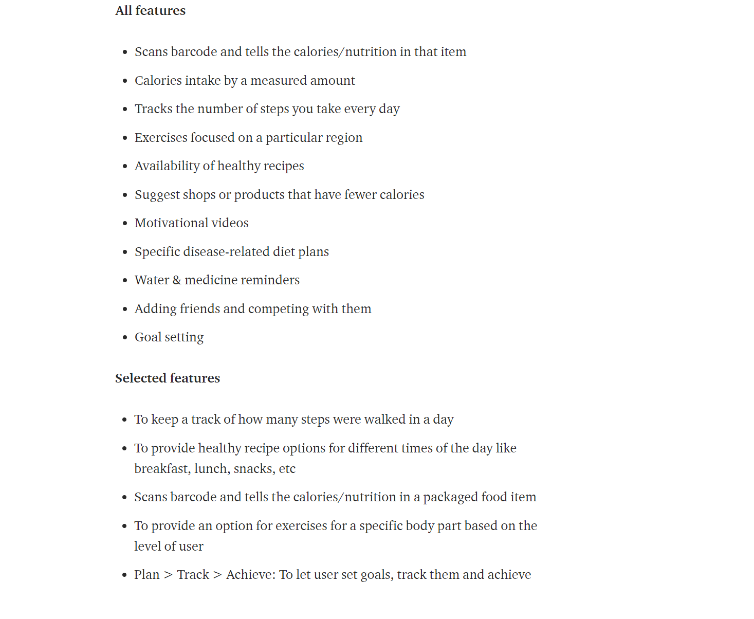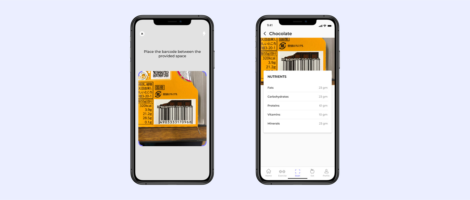 The barcode scanner lets the users scan the barcode of any packed item and tell the user various nutrients and minerals, proteins, fats, carbohydrates, etc. available in the product.