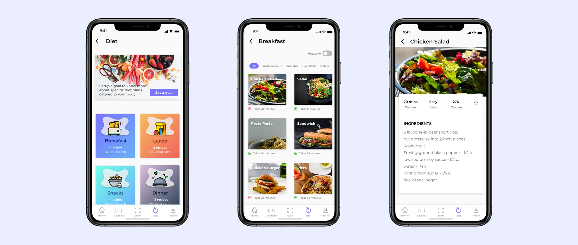 Recipes are Categorized by meals and with appropriate filters. Users can choose from an available list of filters like high calorie, high protein, calorie cautious, home-style, etc according to his/her requirement.