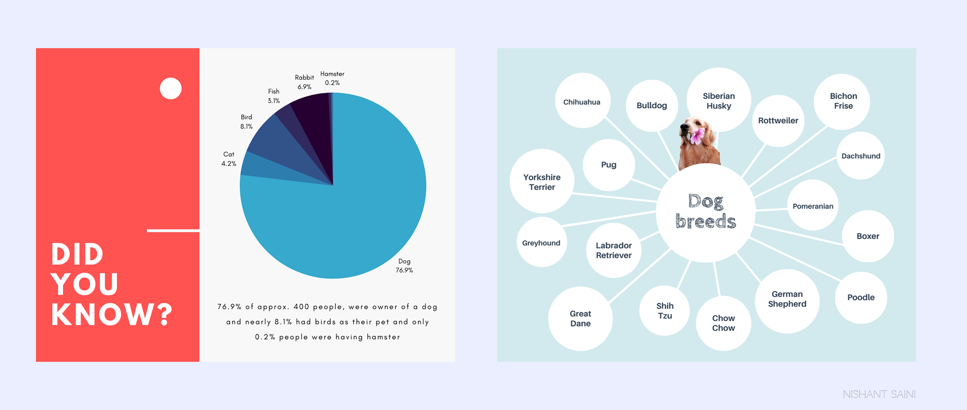 As we can see, 76.9% of people out of 400 are the owners of a dog and very few people own a cat, with 8.1% birds, 3.1% fish, 6.9% rabbits, and only 0.2% hamsters, because dogs are loyal, they make us laugh, are incredibly clever, are so gosh darn cute, having a dog improves your health!