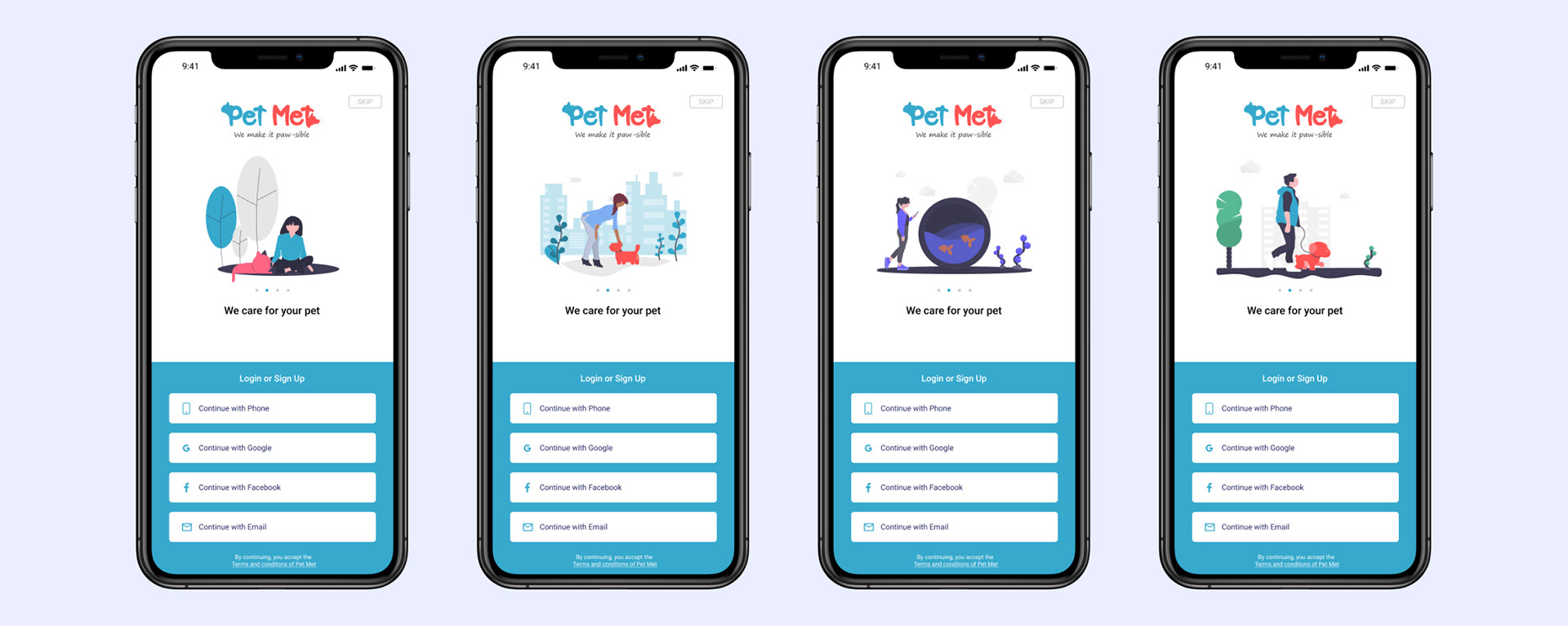 Introducing our app to the users. Displaying some varied Pet Illustrations.